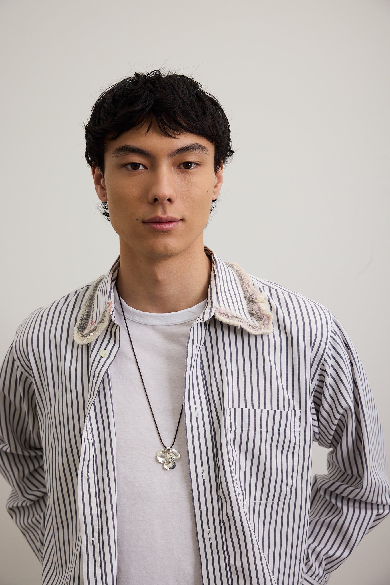 Vintage striped button-down with hand stitched Crochet CollarHandcrafted in TorontoAll Items are one-of-a-kind